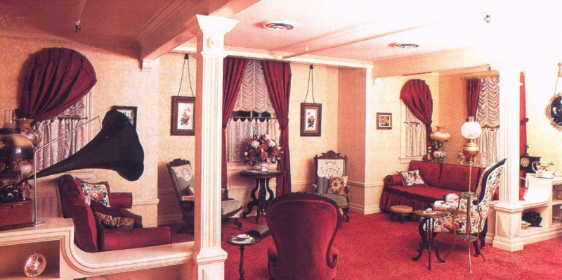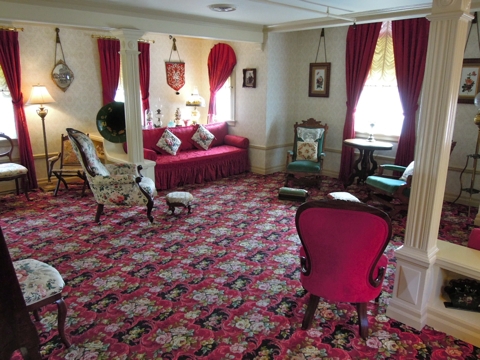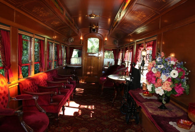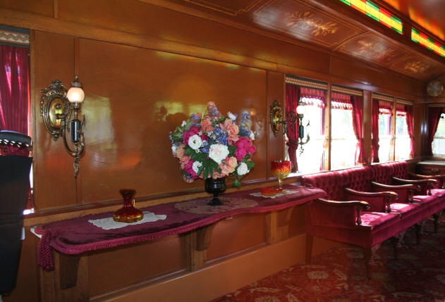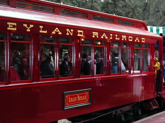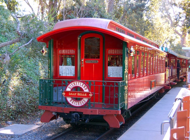 Taking a ride on the Lilly Belle is something special considering none of the remaining train cars on Disneyland’s Railroad are enclosed and certainly not as ornate. According to the history of the railroad, almost all of the original cars had typical train seating (facing forward like you’re on a bus), but once the dinosaur attraction was put in, the train cars were removed and new ones put in place so people in all parts of the train could see the displays. The Lilly Belle was created from one of the original train cars in an effort to create a private car for various dignitaries and VIPs. It was named after Walt’s wife Lillian. The photos below are not mine.